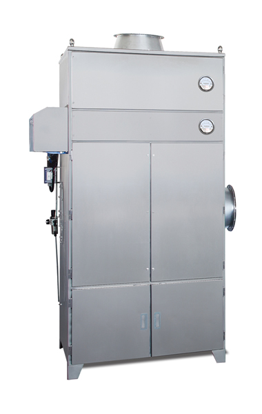 用于对主机滚筒进行抽风(附吸尘) , 并保持工作区域负压,该机器内部为滤筒(压缩空气脉冲除尘)结构,过滤等级可达F9级,也可根据客户要求高达H13级配有减震装置。排风口设有防倒流装置,在停机前关闭排风口,防止排风管路中的废气回流。
